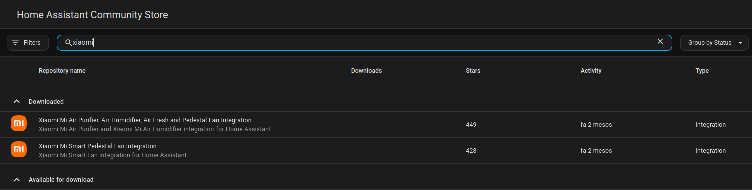 Una vez lo tengamos instalado, tendremos que acceder a Hacs y buscar por "Xiaomi" e instalar el repositorio que se llama "Xiaomi Mi Smart Pedestal Fan Integration".