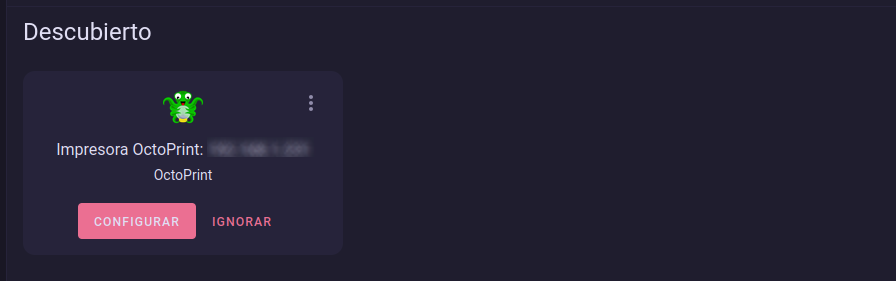 Si habéis configurado OctoPrint en la Raspberry Pi y la tenéis conectada, es muy posible que Home Assistant os haya detectado automáticamente que hay un dispositivo en la red listo para ser instalado: