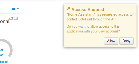 Hacemos lo que nos indica, vamos a nuestra instalación de OctoPi y veremos que nos ha aparecido una notificación para dar acceso a Home Assistant. Hacemos clic en Allow y luego añadimos la contraseña de nuestro usuario.