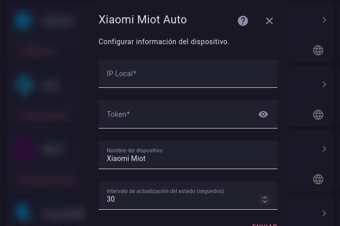 - IP Local: Deberemos de poner la IP local que tiene el dispositivo. Si no sabes que IP tienes, puedes abrir la APP de Xiaomi, haces clic sobre el dispositivo, y luego arriba a los tres puntitos. Finalmente en Más información del dispositivo y luego Red del dispositivo y en este apartado tendrás la IP local del purificador.