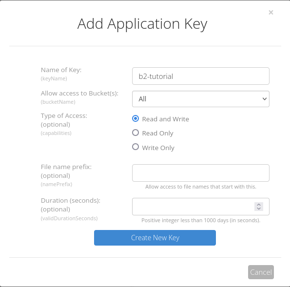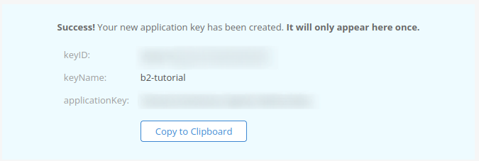 Finalmente para crear la Application Key hacemos clic sobre el botón Create New Key y nos aparecerá un mensaje con los datos. Este mensaje solo aparecerá una vez, por lo que copia el keyID y el applicationKey en un lugar seguro: