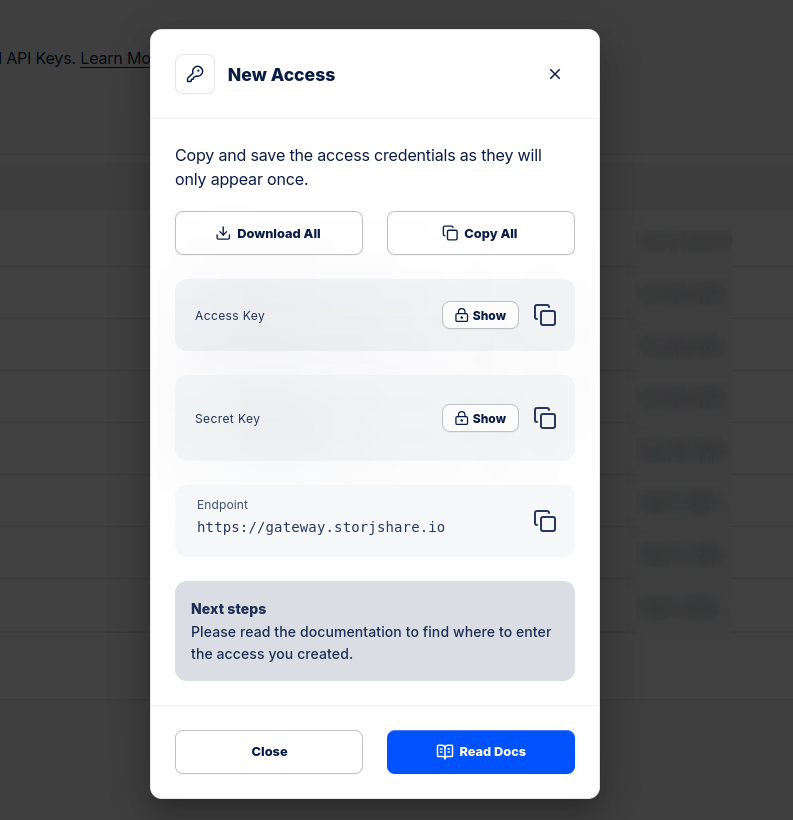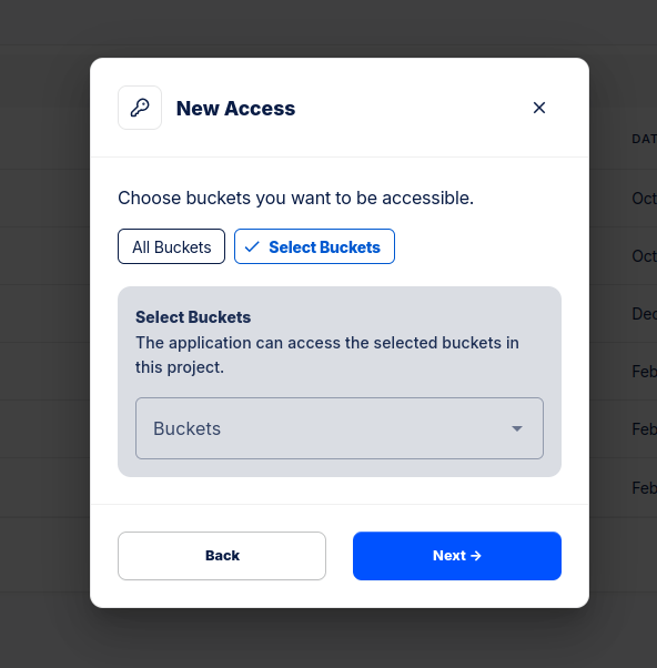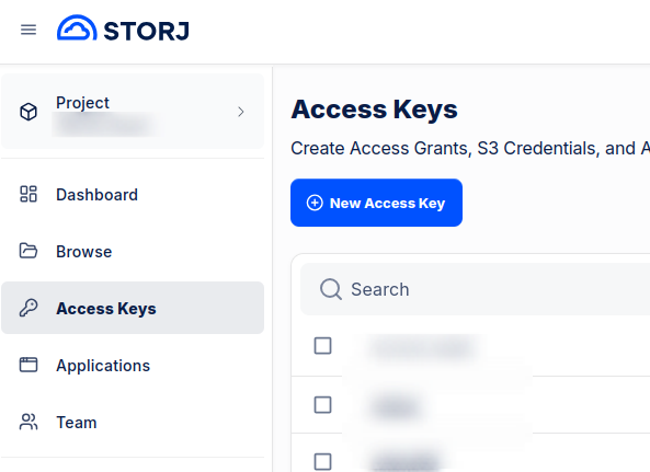 En Storj, iniciamos sesión y seleccionamos el Proyecto donde tenemos nuestro bucket. Allí, en el menú lateral tenemos la opción Access Keys: