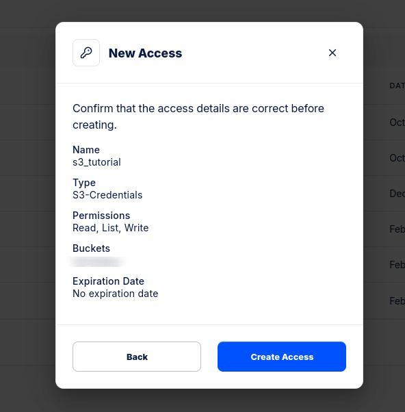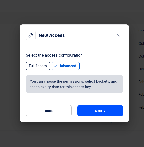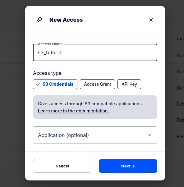 Hacemos clic al botón New Access Key y añadimos un nombre al nuevo acceso y seleccionamos S3 Credentials y continuamos haciendo clic en Next: