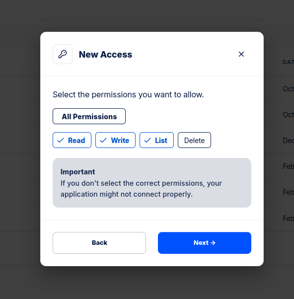 Este nuevo acceso debe contar con todos los permisos excepto el de Delete. Por lo tanto, seleccionamos únicamente los demás permisos: