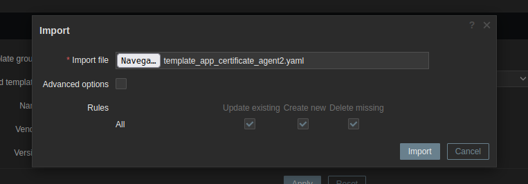 wget https://git.zabbix.com/projects/ZBX/repos/zabbix/raw/templates/app/certificate_agent2/template_app_certificate_agent2.yaml?at=refs%2Ftags%2F6.4.21 -O template_app_certificate_agent2.yamlLuego vamos a Zabbix en el apartado Data Collection - Templates y arriba a la derecha hacemos clic en Import. Seleccioamos el fichero e importamos: