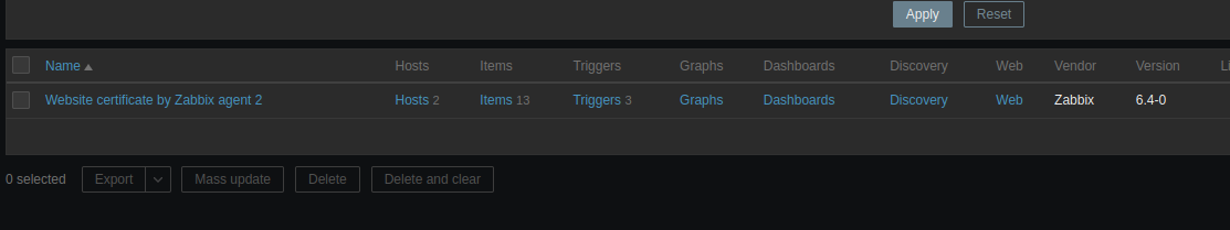 Lo primero que tenemos que hacer, es instalar una plantilla en nuestro Zabbix, concretamente se llama Website certificate by Zabbix agent 2 y podemos descargarnos el fichero en formato YAML.