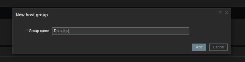 Para mantener todo bien organizado - aunque este paso es opcional - se recomienda crear un nuevo grupo de hosts llamado Domains. En este grupo añadiremos los hosts correspondientes a nuestras páginas web, a los que aplicaremos la plantilla que importamos previamente para monitorizar sus certificados SSL.