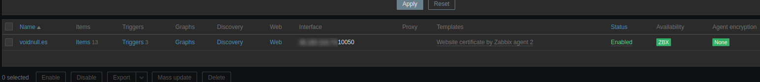 Templates: Selecciona la plantilla que importaste anteriormente, llamada Website Certificate by Zabbix Agent 2.