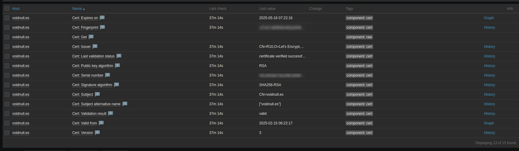 Ante este cambio, es crucial contar con una alternativa que nos permita detectar con antelación la expiración de los certificados y evitar así interrupciones en nuestros servicios. Una excelente solución es utilizar Zabbix, un sistema de monitorización muy completo que, gracias a su plantilla oficial para certificados SSL (disponible aquí), nos permite comprobar el estado y la validez de los certificados de forma automática. Esta plantilla requiere el uso de zabbix-agent2, y ofrece métricas detalladas como los días restantes hasta la expiración, el emisor del certificado, el algoritmo usado, entre otros.