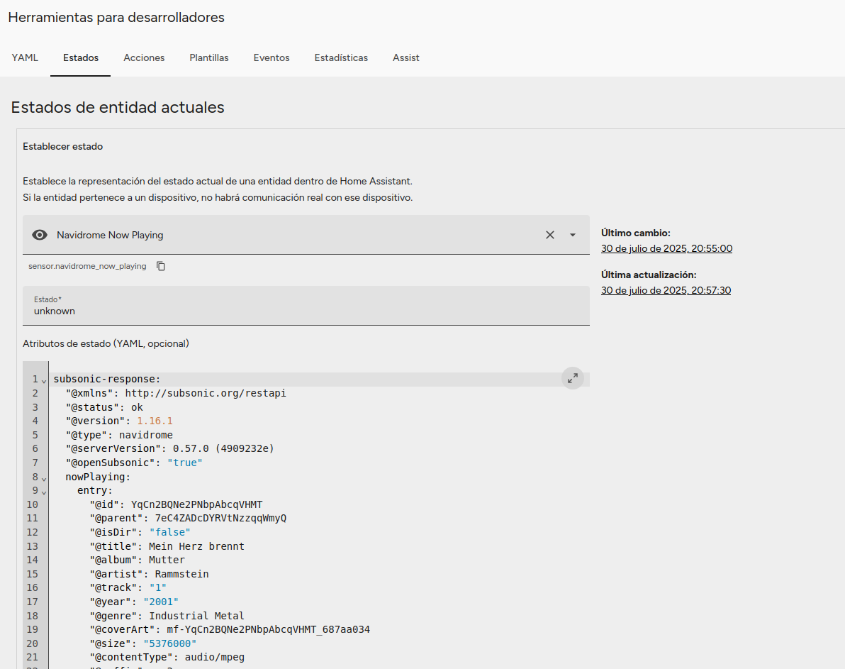 Una vez inicia de nuevo Home Assistant, podemos ir a Herramientas para desarrolladores - Estados y allí buscamos por sensor.navidrome_now_playing: