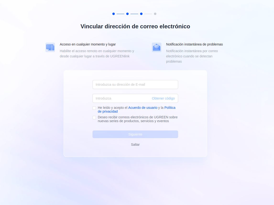 El siguiente paso será vincular una dirección correo electrónico a nuestro NAS. Para ello introducimos nuestro correo electrónico y hacemos clic sobre Obtener código. Al cabo de unos segundos recibirás un correo electrónico de UGREEN con el código. Aceptamos el cuerdo de usuario y Política de privacidad.
