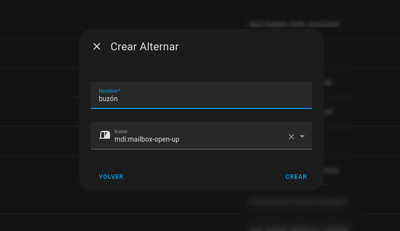 Le ponemos un nombre y un icono. En mi caso le he llamado buzón, por lo que el nombre de la entidad será input_boolean.buzon.