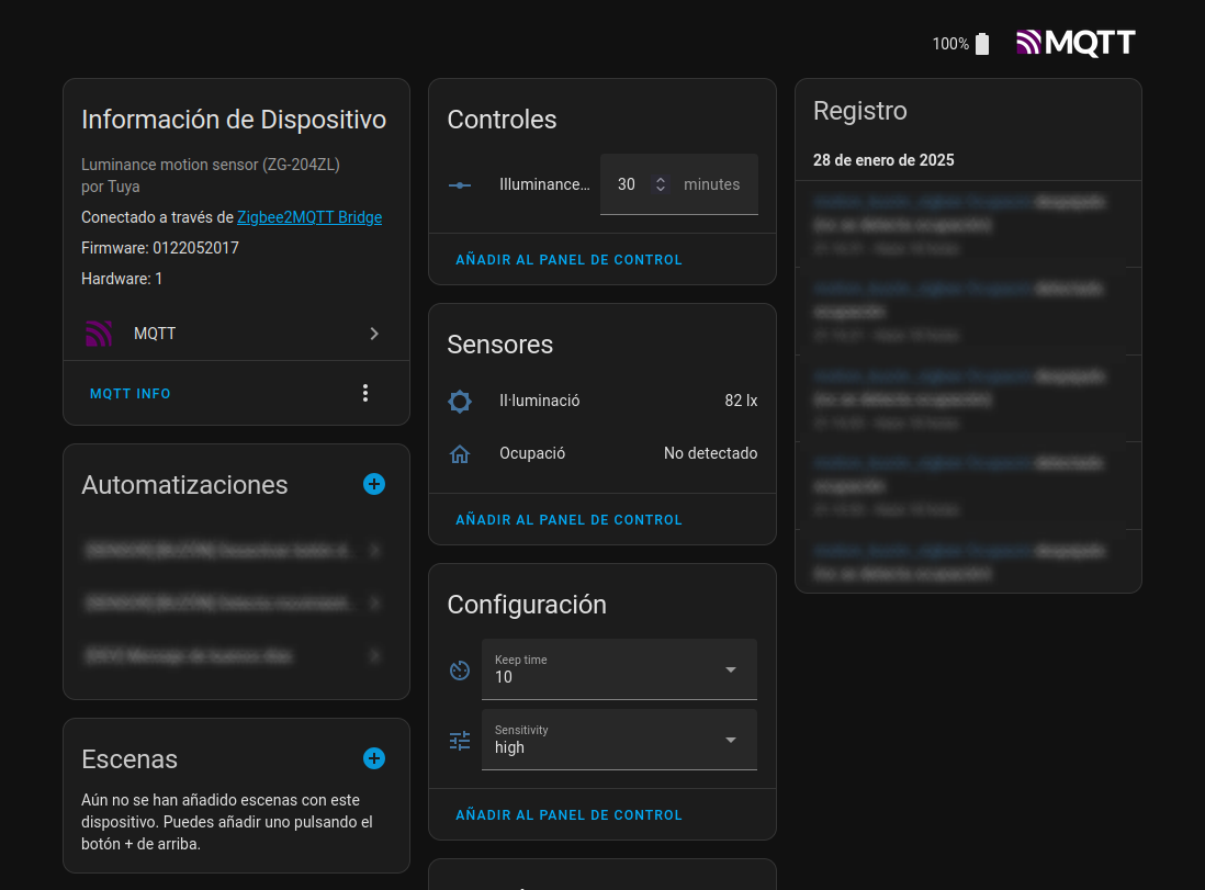 En mi caso utilizaré un sensor de movimiento configurado con Zigbee2MQTT modelo ZG-204ZL de la marca Tuya.