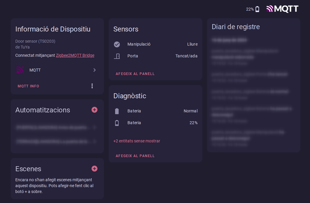 En mi caso, estoy utilizando un enchufe inteligente modelo TS011F_plug_1, el cual es compatible con la integración de Home Assistant a través de Zigbee2MQTT. Este dispositivo me permite controlar y monitorizar el consumo de energía de los aparatos conectados a él de manera eficiente y remota. Para el sensor de puerta, he optado por el modelo TS0203, que también se integra perfectamente con Zigbee2MQTT, proporcionando información precisa y en tiempo real sobre el estado de apertura o cierre de la puerta. La lavadora es una lavadora normal de la marca Bosch.