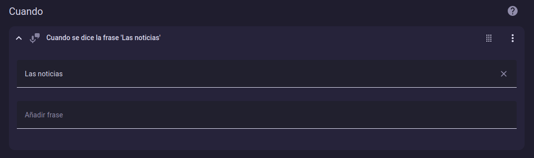 El desencadenante tiene que ser una Frase, por lo tanto cuando se diga "Ok nabu, las noticias" se tiene que lanzar la automatización: