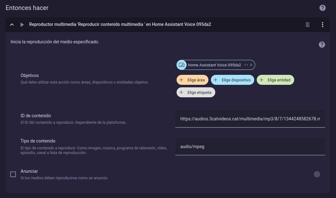 Entonces lo que haremos será reproducir el contenido multimedia en nuestro dispositivo de Home Assistant Voice.